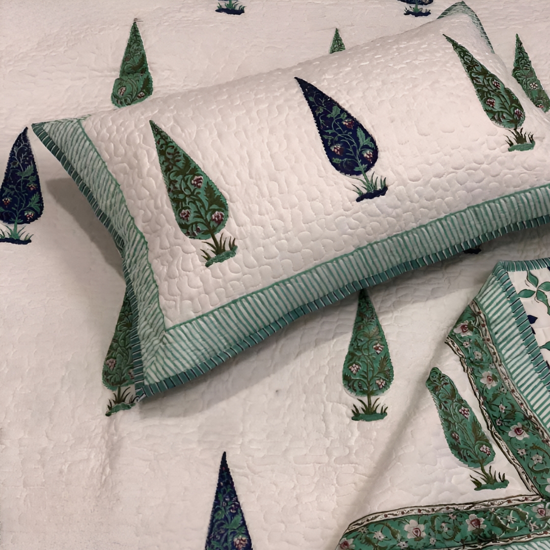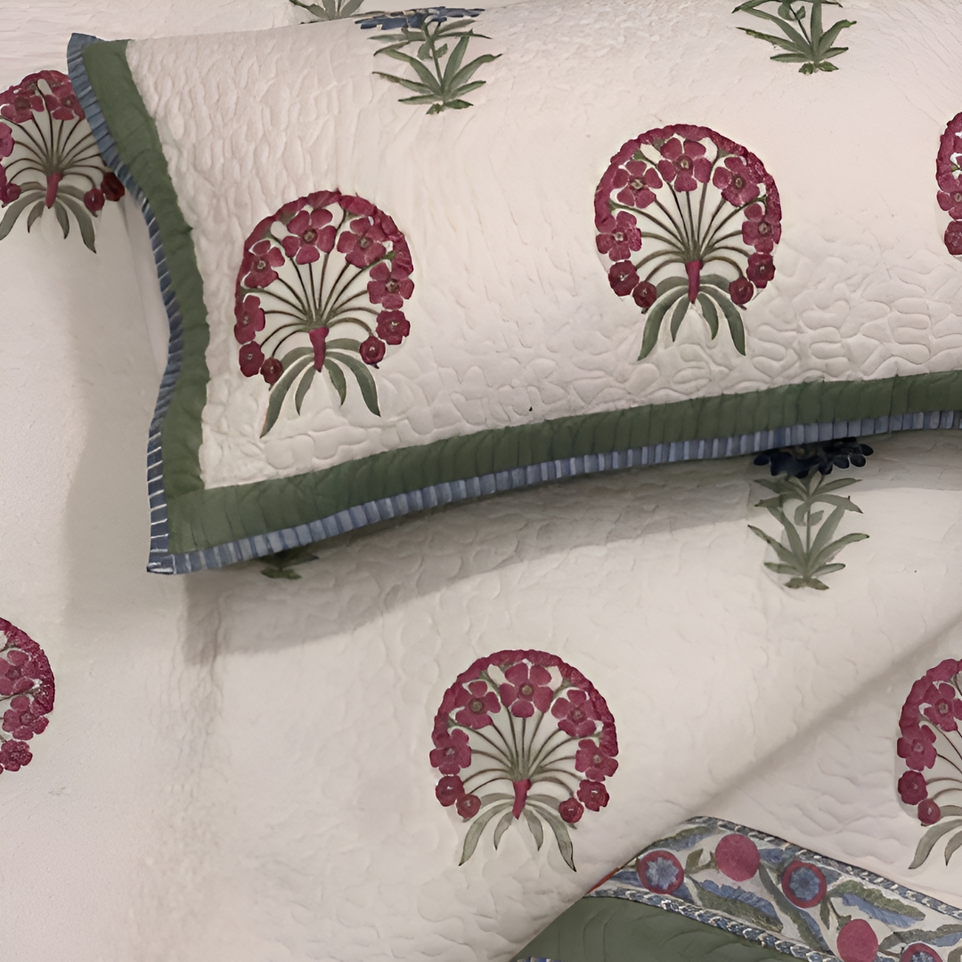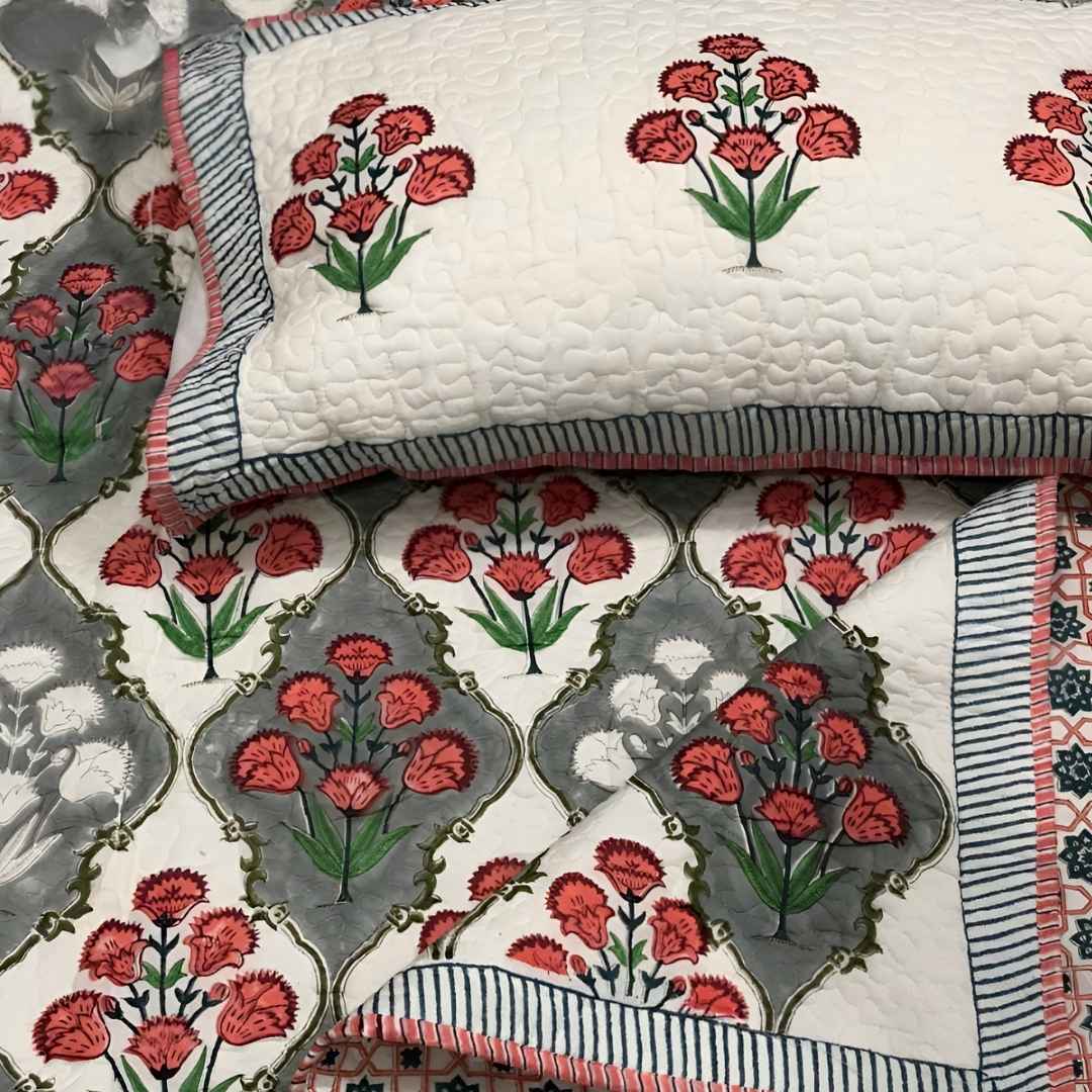 Crafted bed covers, pure cotton, king size, earthy sustainable print, Jaipur style.